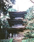 明通寺 とりわけ小浜には寺院が多い。 いづれも歴史と由緒ある古寺、名刹でその数は130にのぼる。 国宝の指定を受けている明通寺の三重の塔と本堂は 巨杉の中に静寂なる姿をたたえ、国宝にふさわしい威厳を保っている。 |